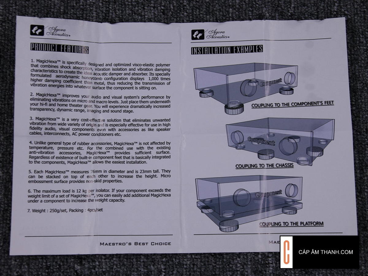 Magic Hexa của Cty Nam Triều Tiên Agora sản xuất là một sản phẩm cực kỳ hiệu quả trong công tác hấp thu năng lượng và loại bỏ nhiễu âm rung; nó được Âu Châu đánh giá món hàng nâng cấp các thiết bị điện tử và loa HIỆU QUẢ NHẤT và RẺ NHẤT trên thị trường hi-end hiện nay. Giải thưởng " linh kiện xuất sắc " của tạp chí Anh quốc HiFi Choice 2012 !